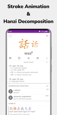 Ar vairāk nekā 6000 teikumu piemēriem, kas ilustrē vārdu lietošanu vairāk nekā 3000 vārdiem, un iebūvētu ķīniešu rokraksta atpazīšanu, lietotne padara mācīšanos intuitīvu. Jūs varat apgūt Hanzi rakstzīmes ar animētām gājienu secībām (vairāk nekā 800 bez maksas un 8700+ pieejamas kā pirkums lietotnē), kā arī izpētīt rakstzīmju dekompozīcijas un fonētiskās grupas. Autentiska kantonīzu zilbju audio ieraksti, ko veicis dzimtās valodas runātājs, palīdzēs pilnveidot izrunu. Studiju efektivitāti uzlabo arī AnkiDroid zibatmiņas karšu atbalsts ar automātisku eksportu, lai jūs varētu sistemātiski atkārtot un nostiprināt zināšanas.